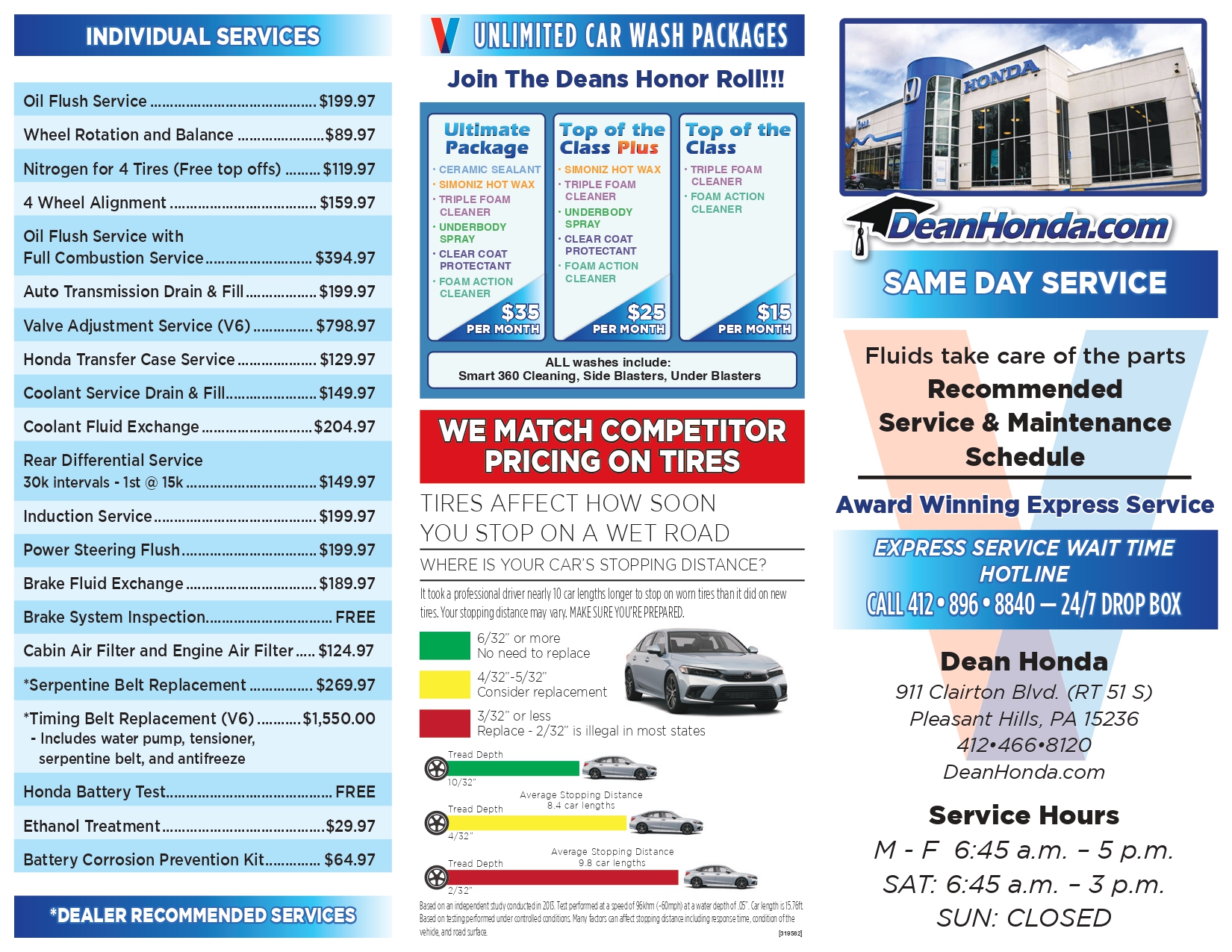Properly rotated tires can last longer, improve gas mileage, and provide a smoother ride and more uniform tire wear. Our Honda trained technicians will rotate and properly inflate all four tires.